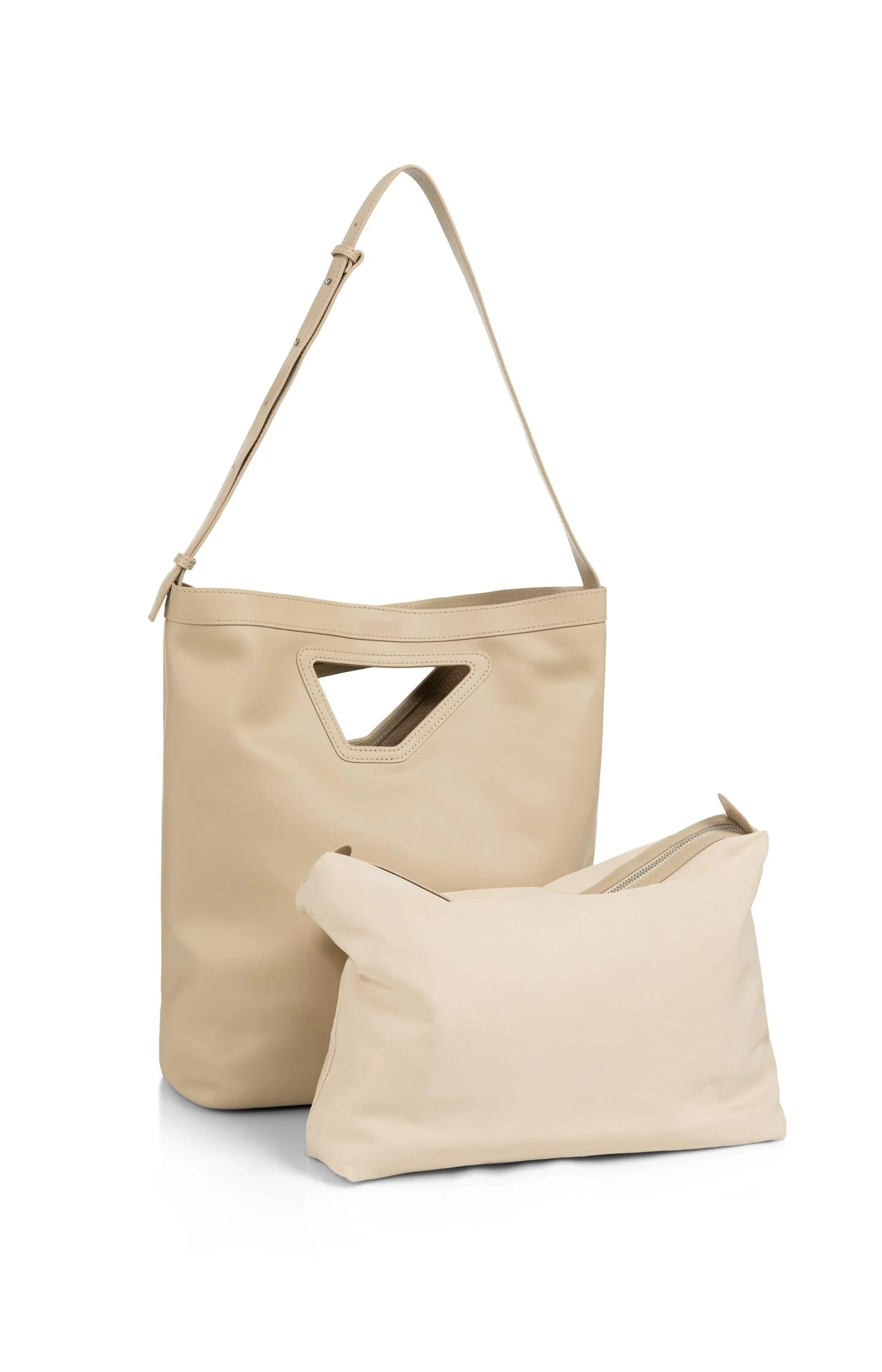 This stylish leather bag features a striking triangle-shaped handle and an adjustable shoulder strap. It includes a lined interior and comes with a detachable zip pouch. The smooth leather and minimalist design make it a timeless piece, perfect for everyday use with a modern twist. A refined essential for your daily wardrobe. Dimensions: height 38 cm, width 40 cm, base 14 cm, opening 37 cm, shoulder strap adjustable up to 36 cm.
