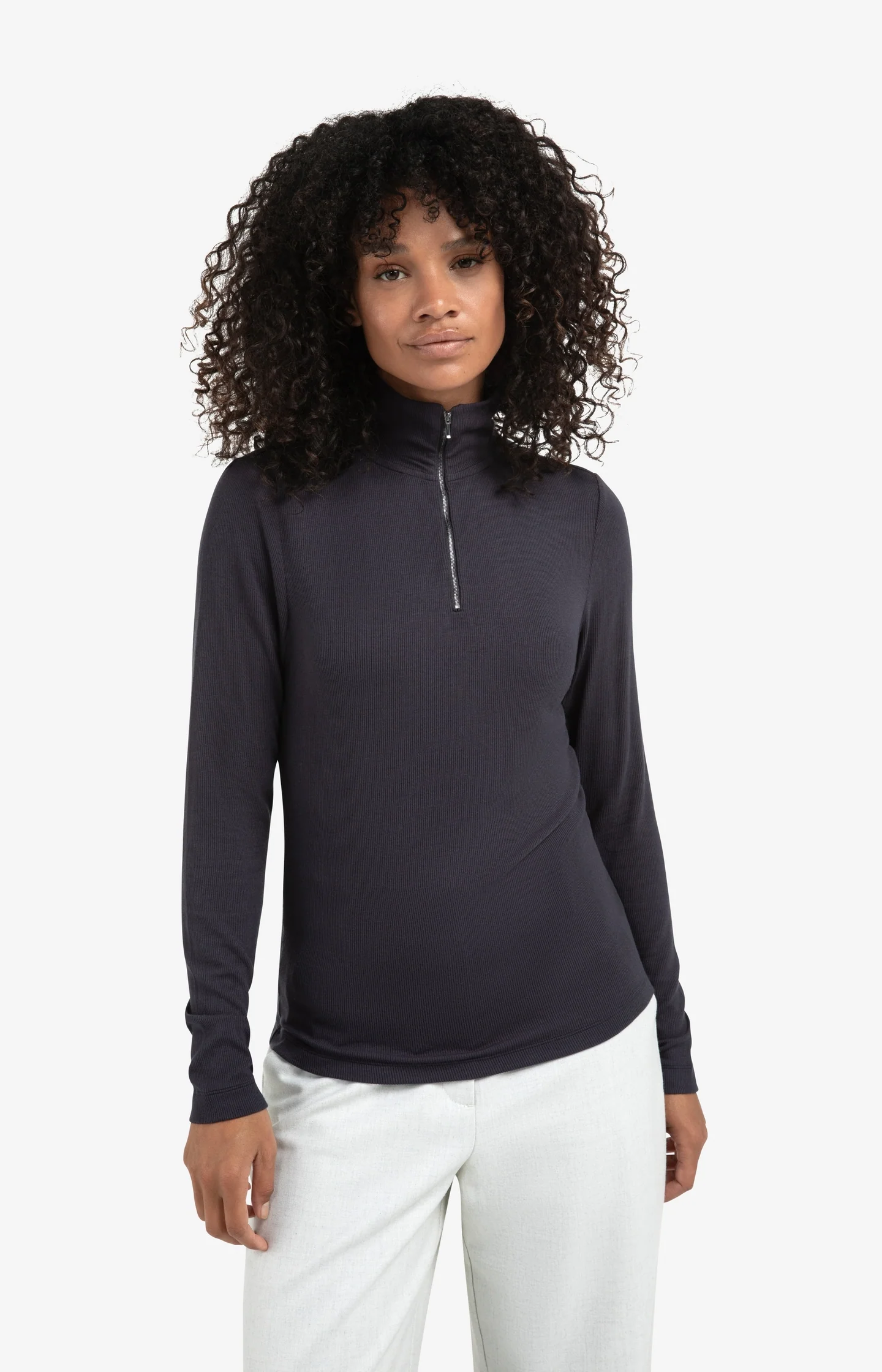 This fitted top is made from a soft ribbed jersey with stretch. It features long sleeves and a stand-up collar with a zip closure, adding a sporty and modern touch. Perfect to wear on its own or layered under a cardigan or blazer. A versatile wardrobe essential for everyday styling. The model is 173 cm and wears size S.