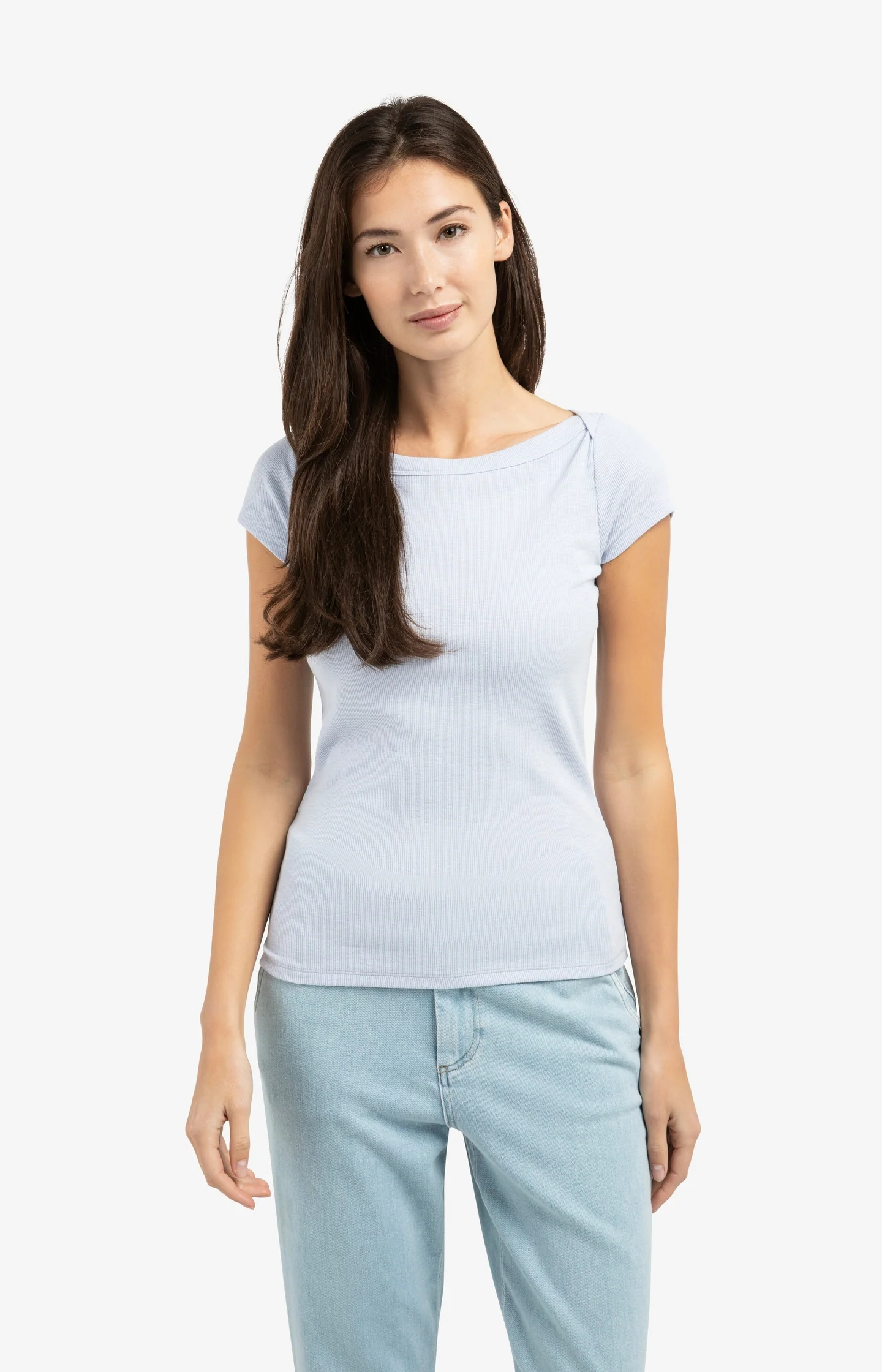 This finely ribbed top is made from a soft, stretchy fabric and features an elegant boat neckline. The short sleeves and fitted silhouette create a feminine and comfortable look. Perfect to wear on its own during warmer days or layered under a blazer or cardigan. The model is 175 cm and wears size S.