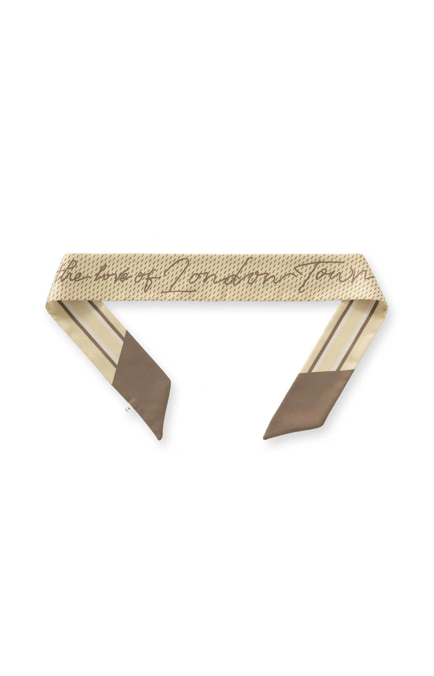 This refined narrow scarf is made from a smooth woven fabric and features an all-over pattern with the handwritten text the love of London Town. The soft neutral tones and tapered shape make it a stylish accessory to wear around your neck, in your hair, or tied to your bag.